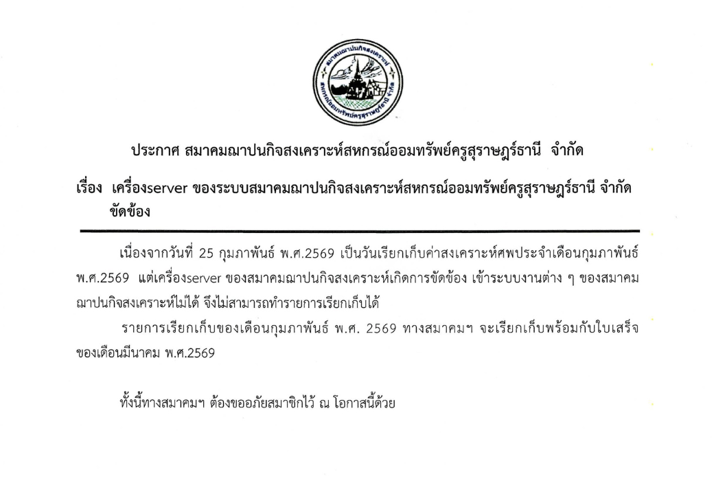 เครื่อง server ของระบบสมาคมณาปนกิจสงเคราะห์ สหกรณ์ออมทรัพย์ครูสุราษฎร์ธานี จำกัด ขัดข้อง