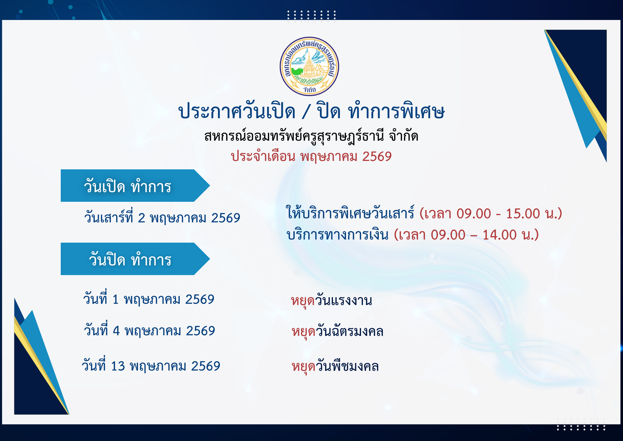 ประกาศวันเปิด/ปิดทำการ พิเศษ ประจำเดือน พฤษภาคม 2569